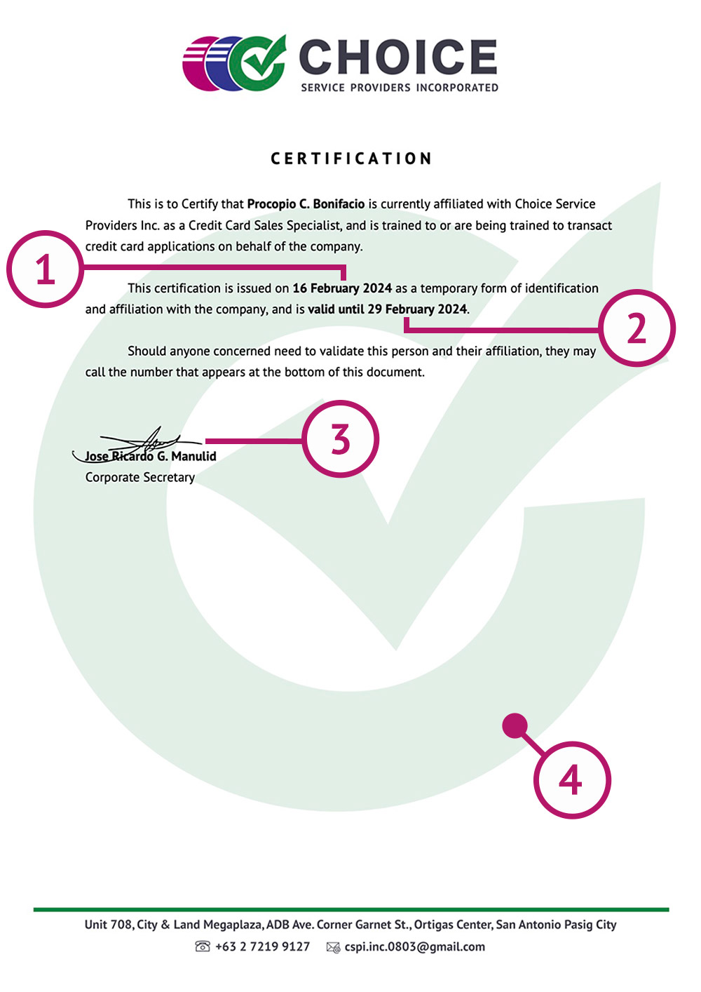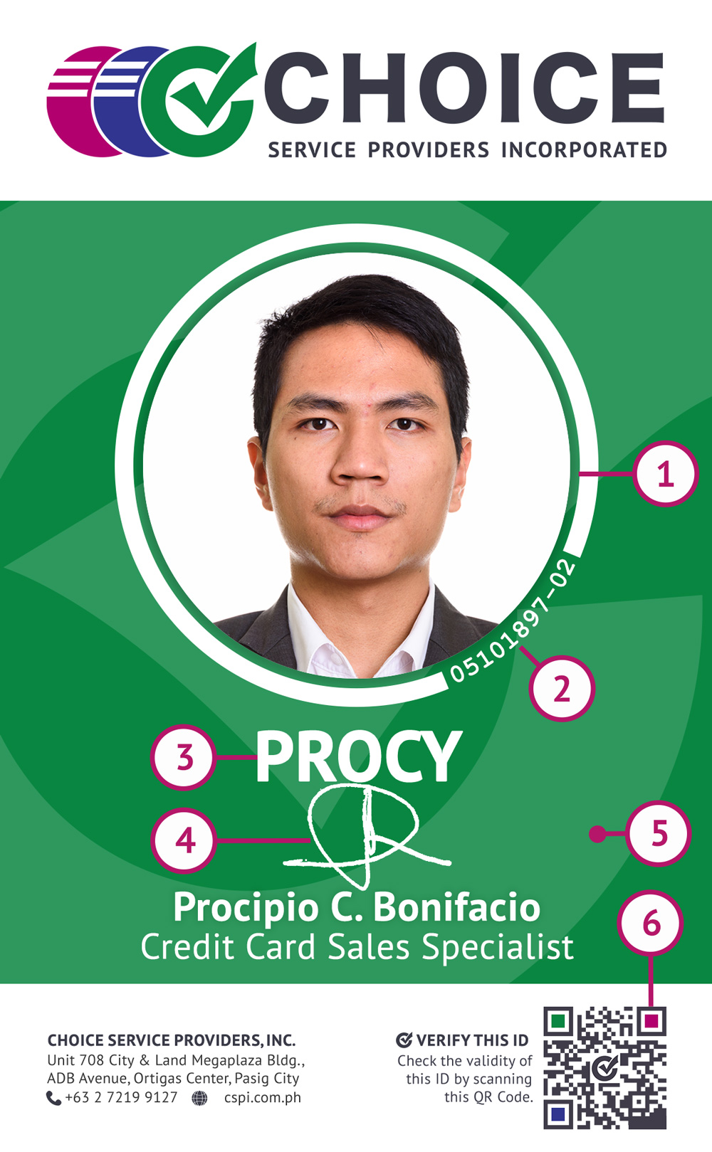 Only Choice Service Providers Inc., may issue IDs and certificates of affiliation to its employees and agent partners. No other person, group or entity shall print any ID or document resembling that which is officially issued by the company.