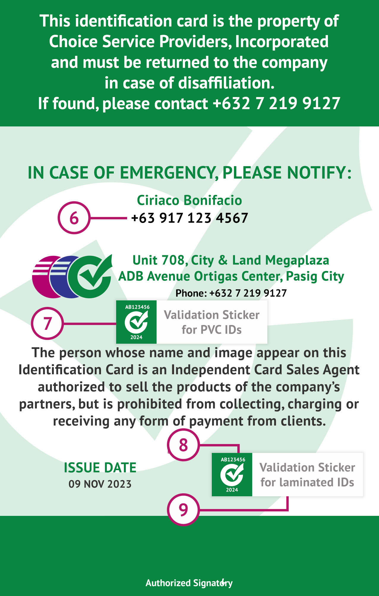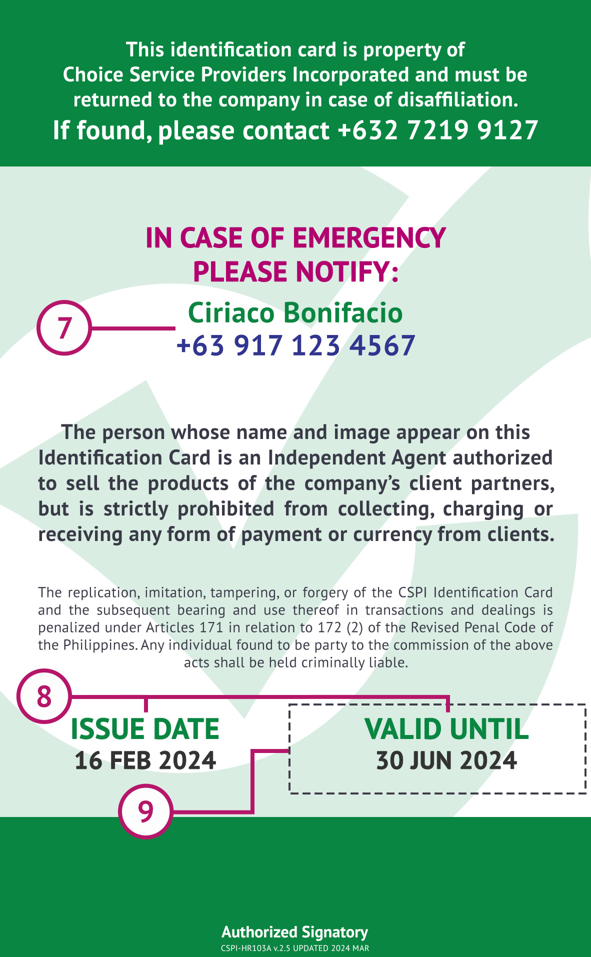 Issued between 01 June 2016 until 15 February 2024. Issued in two forms – PVC (Plastic) IDs, for agents who joined CSPI before 2019, and Laminated IDs. All IDs in this design or layout are considered invalid after 15 May 2024.