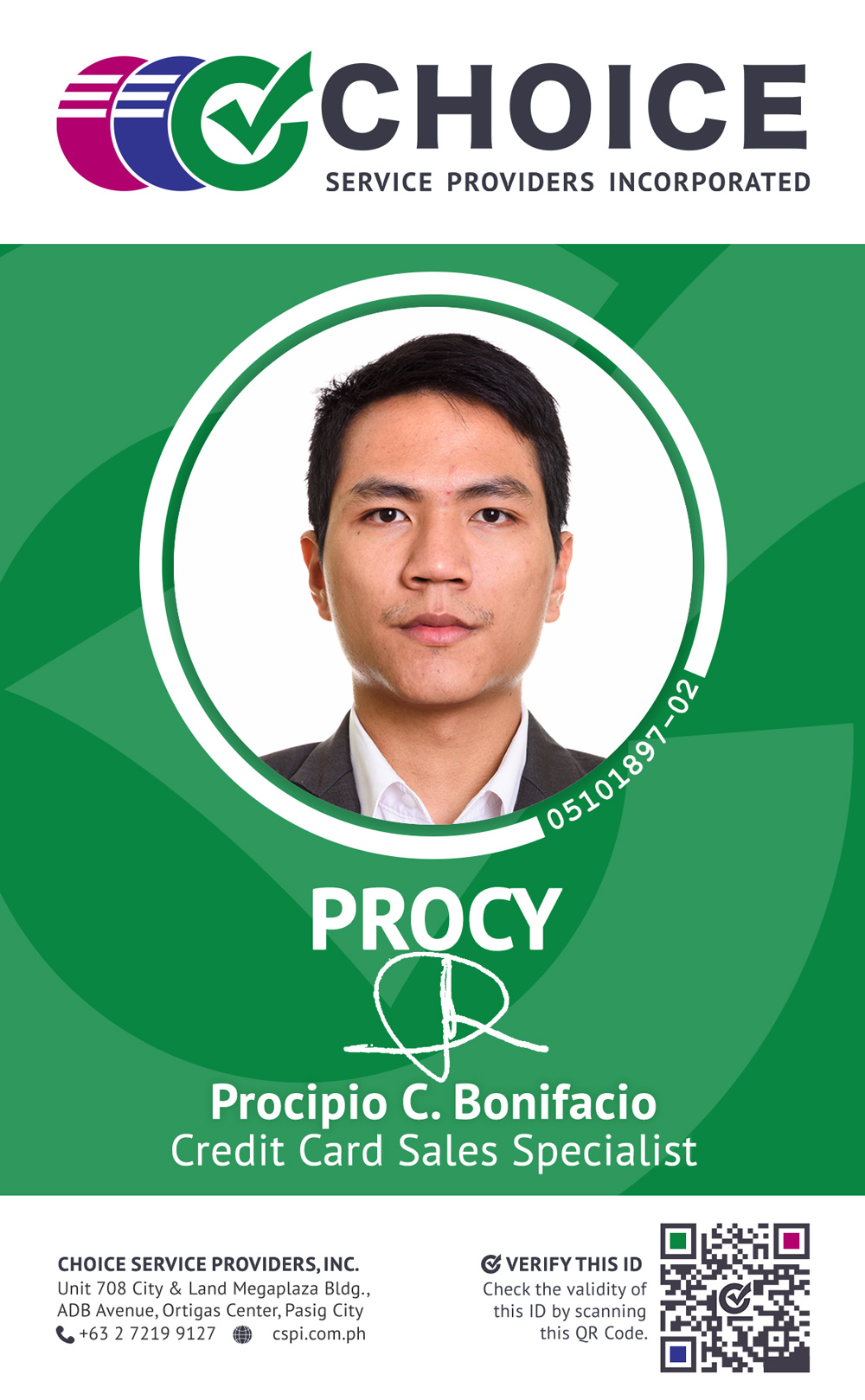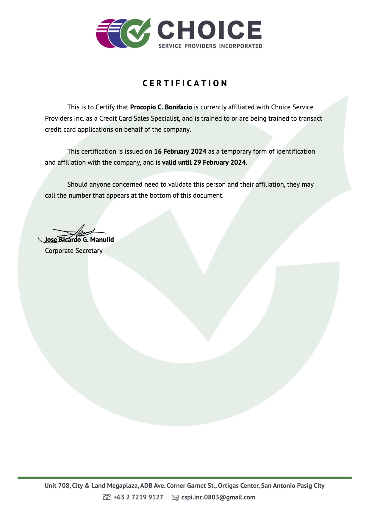 Only Choice Service Providers Inc., may issue IDs and certificates of affiliation to its employees and agent partners. No other person, group or entity shall print any ID or document resembling that which is officially issued by the company.